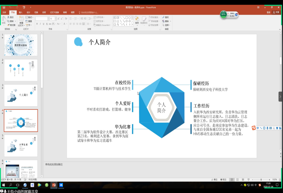 接下来是乔云瑞学长,2014级的计算机科学与技术专业毕业生,毕业在微博视频部门任职期间,先后负责微博故事的生产消费业务、小视频消费业务以及星球视频(即将上线)的从零开发,2020年5月份加入快手消费部门。学长以“平凡之路”作为总括,具体介绍了自己的大学四年生活的每个阶段,他分别用一个关键词概括,既讲述了大学如何规划为同学们提供方向指导,又指出了专业学习的技巧与方法,在鼓励自学的同时也提醒积极参加比赛,在项目中提升自我。之后详细讲述应聘工作中如何应对社招和校招两种招聘,对比提出更深入的技术要求。