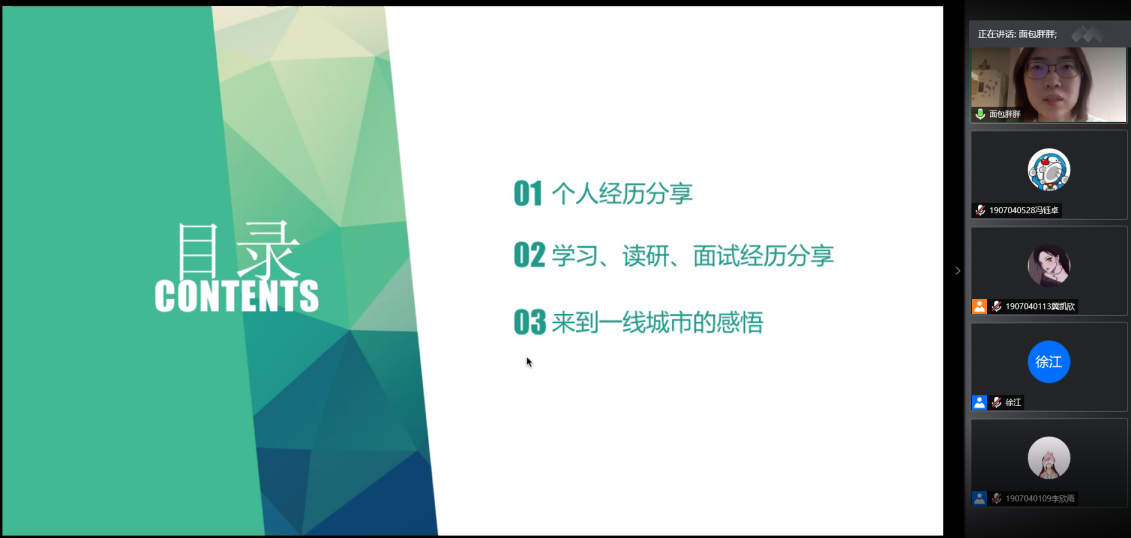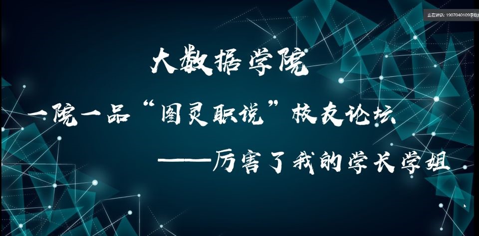 在腾讯会议开展“一院一品”项目第三期“图灵职说”校友论坛——厉害了我的学长学姐,旨在疫情期间通过优秀校友的分享帮助同学们解决居家学习的困惑和迷茫。大奶熟女党委书记郭书杰老师,校团委副书记刘玉巍老师,大奶熟女党委副书记杨晓东老师,学生科科长魏春燕,团委周宇宏老师及全体辅导员、班主任等参加了此次论坛,二百四十余名学生收听了此次论坛。