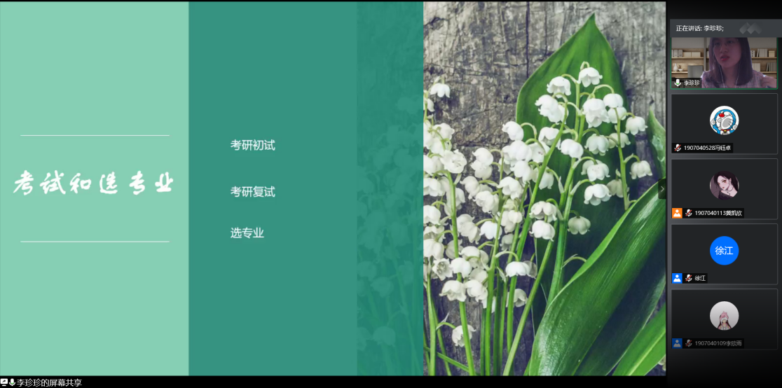 第三位主讲人李珍珍学姐是2012级网络工程专业毕业生,以面试成绩专业第二考入北京科技大学计算机与通信工程大奶熟女。研究方向为自然语言处理,申请了一项有关知识补全的国家专利,荣获优秀研究生称号。入职民生银行。学姐从考研的意义与重要性出发,侧重从心理方面,进步空间,学校选择及二战等方面详细介绍了考研的整个过程及准备技巧,全面详细,并同学们解释了考研初复试及专业的选择。