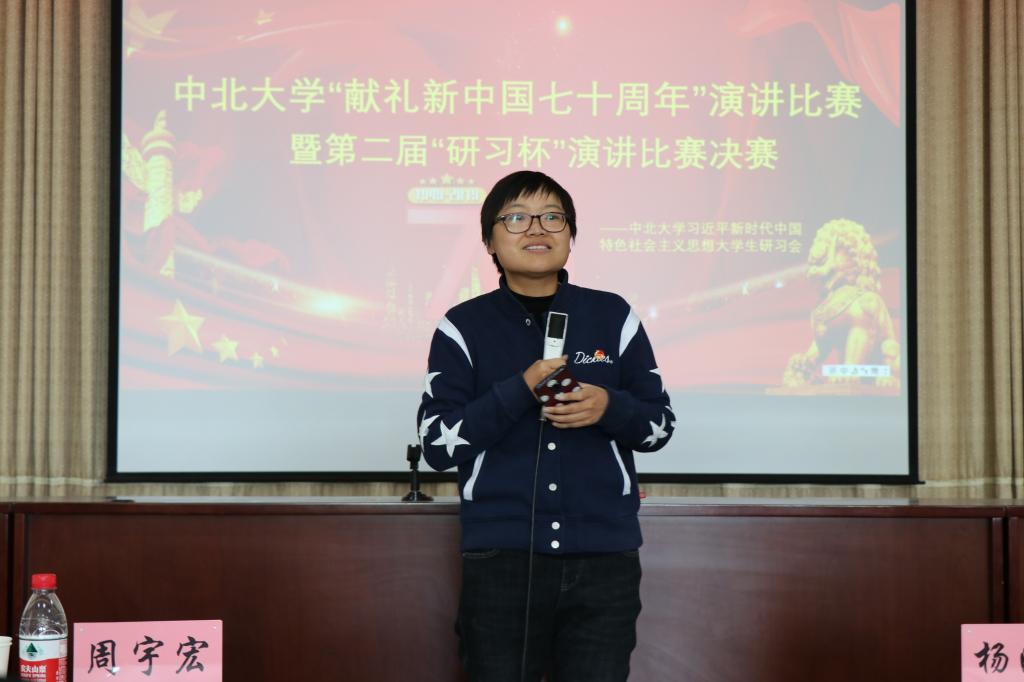 今年正值中华人民共和国成立七十周年,中北学子用这样一种方式来表达对祖国的热爱。各位选手通过精彩的演讲,展示了中北学子的精神风貌。本次比赛,让我们从激动演讲的选手的表演中看到了正在腾飞的中国,让我们从演讲中感受到了作为一名中国人的骄傲与自豪。将我们心里对祖国的热爱彻底唤醒,我为祖国骄傲,祖国为我自豪的声音响彻脑海。作为当代大学生,我们代表着祖国的希望和未来,所以我们一定要脚踏实地,为祖国建设添砖加瓦,为建设社会主义奉献自己,回报祖国。
