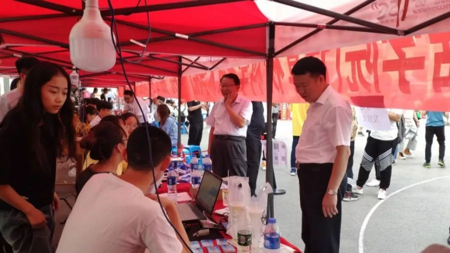 校长沈兴全、校党委书记李忠人一行也到达了大本营,亲切慰问现场的迎新工作,看着不断到来的新同学和认真工作的志愿者,他们的脸上露出了满意的笑容。