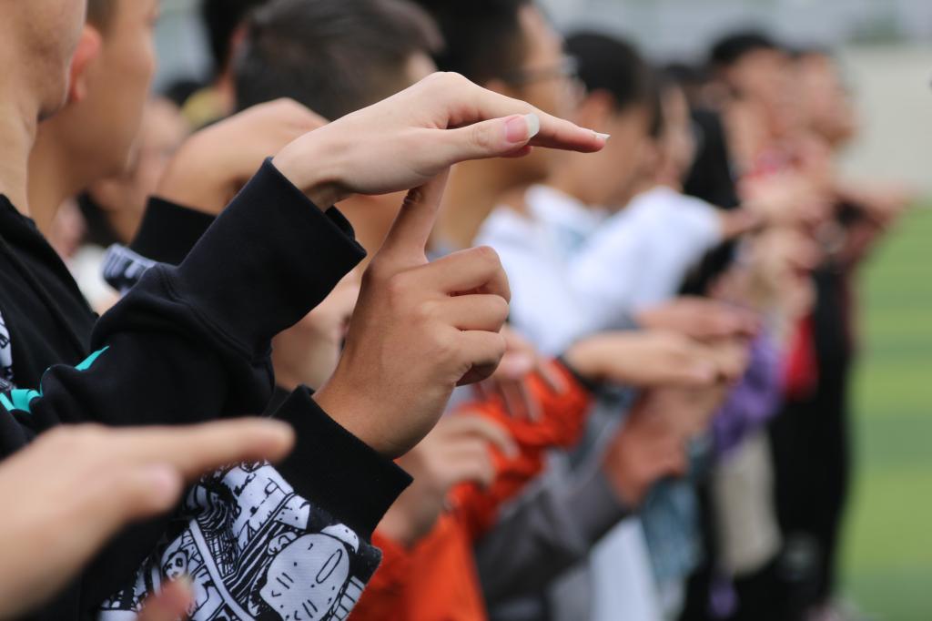 在短暂的跑步热身和灵活度小考验后,一系列素质拓展运动和游戏也有序地开始进行。学生干部们被分成了五组,每组经过讨论推选出队长,以及制定好队名、口号、队歌,陆续完成了速度与激情、雷区取水、极速60秒、沙场点兵等考验智商、凝聚力和团队信任度的充满意义的游戏。